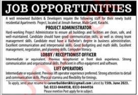 Private Company Karachi, karachi Sindh Pakistan invites applications from eligible candidates for the post of project administrator, lobby officer, receptionist and lift operator as per advertisement of June 4, 2023 published in daily Jang Newspaper. Candidates with Bachelor and Master etc. educational background will be preferred.