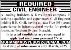 Vacant posts including civil engineer are announced in Builders & Developers Pvt Ltd Karachi, karachi Sindh Pakistan as per 9 March 2025 advertisement in daily Jang Newspaper. Bachelor etc. educational qualification will be preferred.
