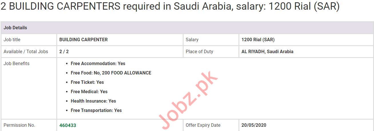 A well Konwn KSA based company announced vacancies for Building Carpenters in Al Riyadh Saudi Arabia through Al waqas Enterprises Overseas Employment Promoters. Free Accommodation, Free Food, Free Ticket, Free Medical, Health Insurance, Free Transportation are provided by the company.