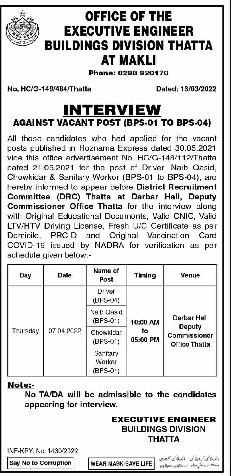 Vacant posts including naib qasid, sanitary worker, driver and chowkidar are announced in Building Division Thatta, thatta Sindh Pakistan as per 19 March 2022 advertisement in daily Dawn Newspaper. Candidates with Middle and Primary etc. educational background will be preferred.