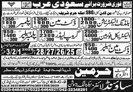 Vacant posts including duct man, plumber, building electrician, group leader, electrical foreman, duct man helper and plumber helper are announced in Sound Lines Recruiting Promotion Riyadh, riyadh Saudi Arabia as per 17 August 2025 advertisement in daily Express Newspaper. Persons with Middle etc. education can apply.