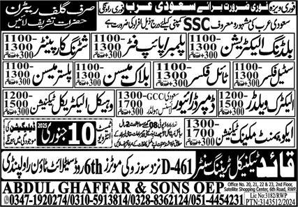Abdul Ghaffar & Sons Overseas Employment Promoters is looking for candidates for following posts as per job advertisement published in daily Express Newspaper of January 7, 2025 for location Riyadh, riyadh Saudi Arabia: