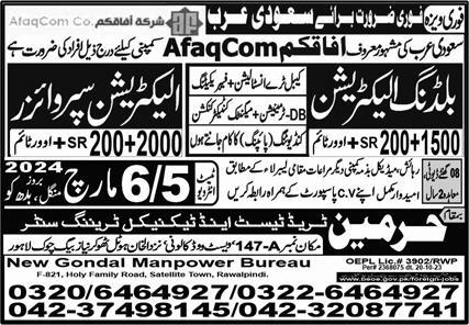 Vacant posts including building electrician and electrician supervisor are announced in New Gondal Manpower Bureau Riyadh, riyadh Saudi Arabia as per 5 March 2024 advertisement in daily Express Newspaper. Preferred Education is Matric, Intermediate and Middle etc.