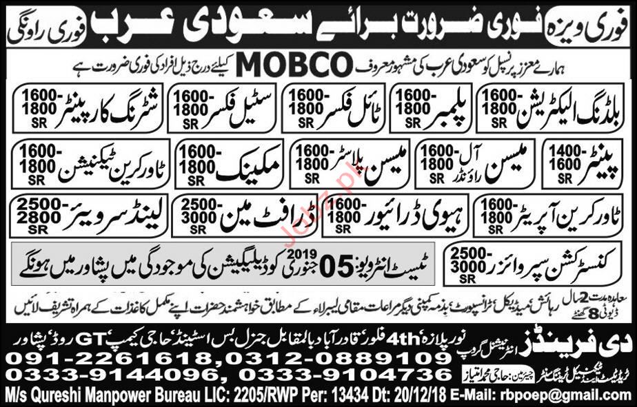 A well reputed and well established company is looking for Building Electrician, Plumber, Tile Fixer, Steel Fixer, Shuttering Carpenter, Painter, Mason, Mechanic, Crane Technician, Crane Operator, Heavy Driver, HTV Driver, Draft Man, Land Surveyor, Construction Supervisor in Saudi Arabia.