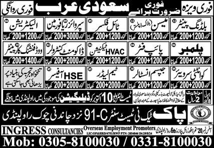 Ingress Consultancies Overseas Employment Promoters is looking for candidates for following posts as per job advertisement published in daily Express Newspaper of October 2, 2024 for location Riyadh, riyadh Saudi Arabia: