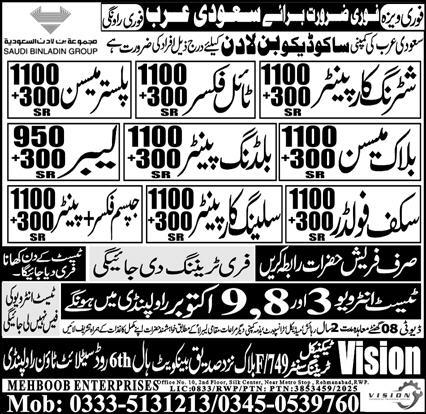 Vacant posts including Shuttering Carpenter, Block Mason, Building Painter, Painter, Scaffolder, Gypsum Fixer, Tile Fixer, Plaster Mason, Ceiling Carpenter and Labor are announced in Ms Mehboob Enterprises Makkah, makkah Saudi Arabia as per 22 September 2025 advertisement in daily Express Newspaper. Preferred Education is Middle, Matric, Intermediate and Primary etc.