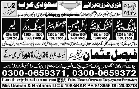 Latest Faisal Usman Overseas Employment Promoters Construction Posts Saudi Arabia 2025