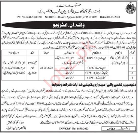 Building Division Nawabshah, nawabshah Sindh Pakistan invites applications from eligible candidates for the post of chowkidar, naib qasid, jeep driver, watchman and sanitary worker as per advertisement of May 14, 2023 published in daily Jang Newspaper. Middle, Matric and Primary etc. educational qualification will be preferred.