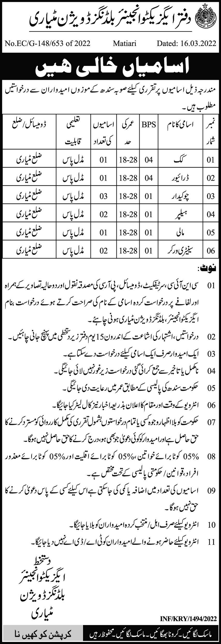 Vacant posts including sanitary worker, helper, cook, driver, chowkidar and mali are announced in Building Division Matiari, matiari Sindh Pakistan as per 23 March 2022 advertisement in daily Express Newspaper. Primary and Middle etc. educational qualification will be preferred.