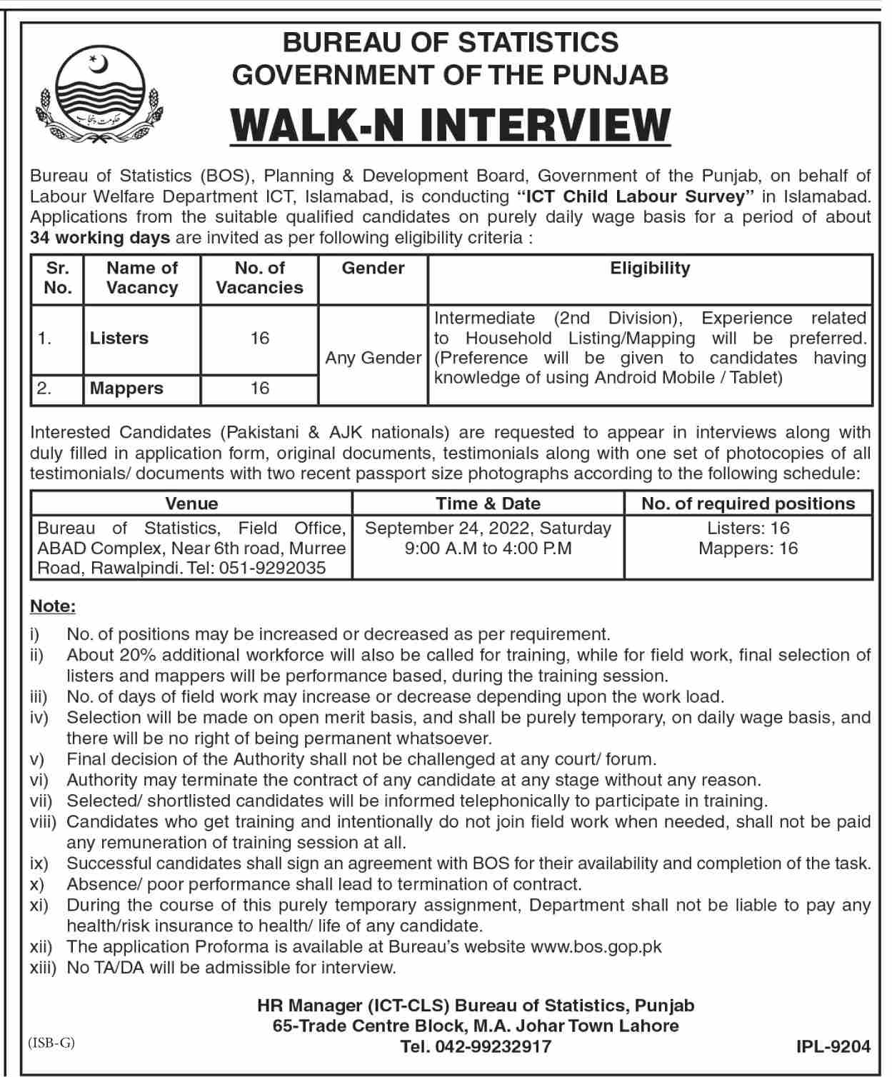 Bureau of Statistics is looking for candidates for following posts as per job advertisement published in daily Dawn Newspaper of September 16, 2022 for location Lahore, rawalpindi Punjab Pakistan: