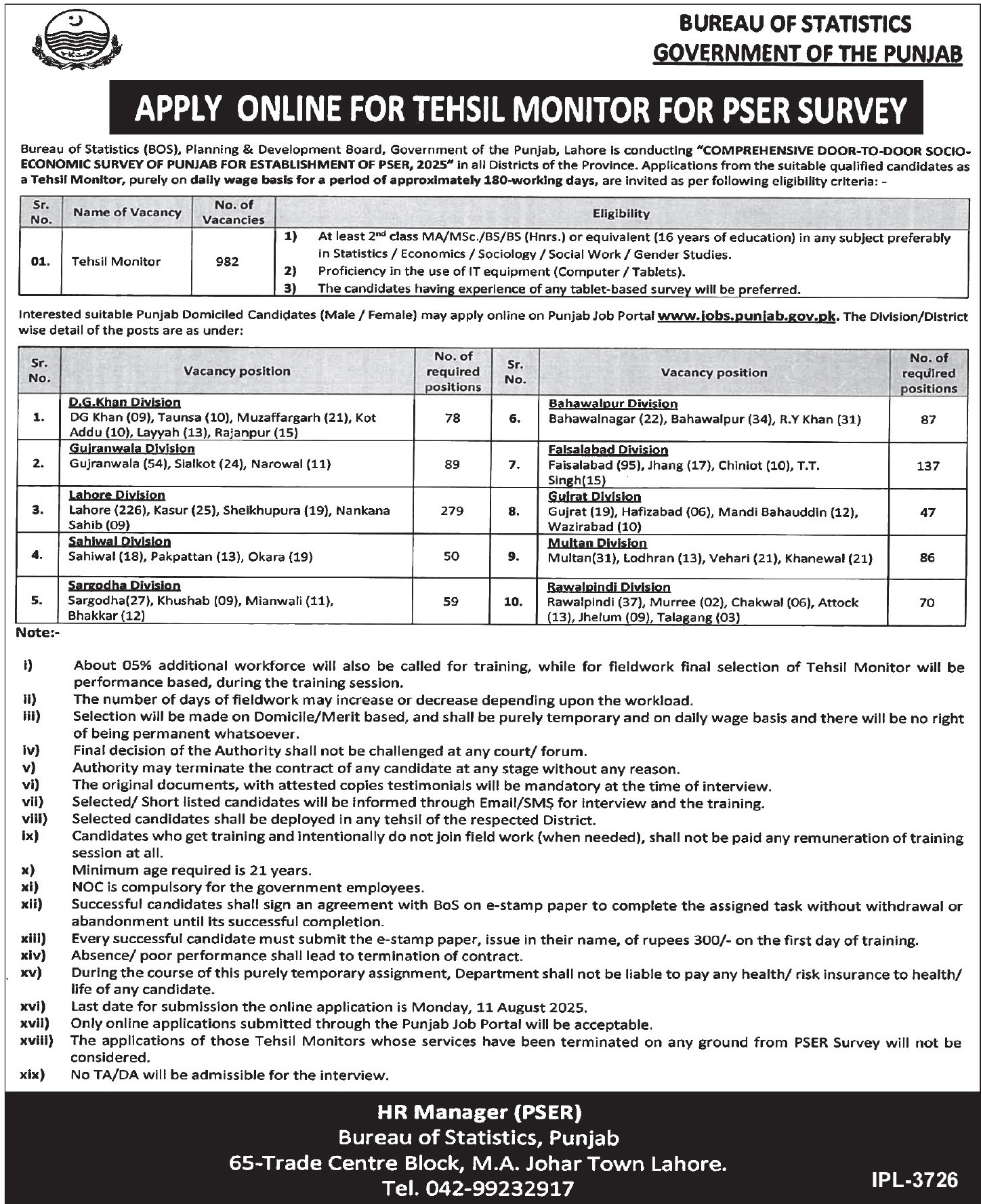 Bureau of Statistics jobs advertisement dated about 25 July 2025 in daily Express Tribune Newspaper invites application for the vacant post of tehsil monitor in Johar Town Lahore, lahore Punjab Pakistan. Candidates with MS, Master, M.sc and Bachelor etc. educational background will be preferred.