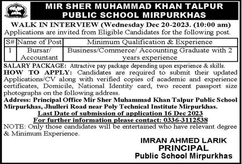 Vacant posts including accountant and bursar are announced in Mir Sher Muhammad Khan Talpur Public School MSMKTPS Mirpur Khas, mirpur khas Sindh Pakistan as per 9 December 2023 advertisement in daily Kawish Newspaper. Persons with MBA, M.com, Bachelor, B.com, Master and BBA etc. education can apply.