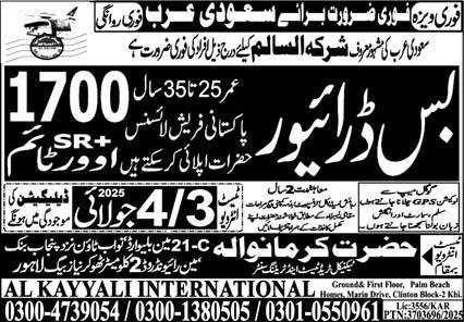Hazrat Karmanwala Technical Trade Test & Training Center Dammam, taif Saudi Arabia invites applications from eligible candidates for the post of bus driver, htv driver and driver as per advertisement of July 3, 2025 published in daily Express Newspaper. Preferred Education is Matric and Intermediate etc.