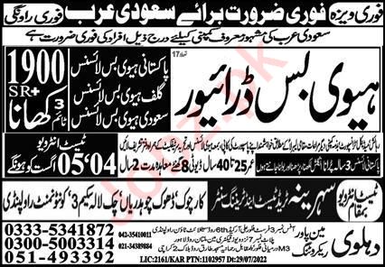 Sehreena Trade Test and Training Center Riyadh, dammam Saudi Arabia invites applications from eligible candidates for the post of driver, bus driver, htv driver and heavy bus driver as per advertisement of August 4, 2022 published in daily Express Newspaper. Preferred Education is Matric and Intermediate etc.