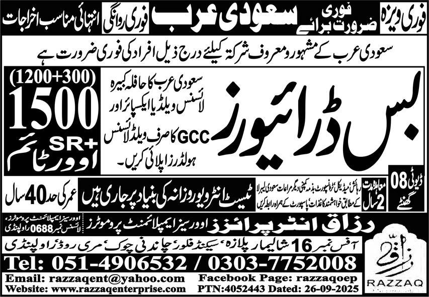 Razzaq Enterprises Dammam, tabuk Saudi Arabia invites applications from eligible candidates for the post of htv driver, bus driver and driver as per advertisement of November 21, 2025 published in daily Express Newspaper. Persons with Intermediate and Matric etc. education can apply.