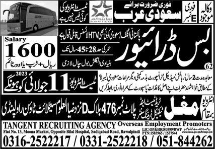 Tangent Recruiting Agency latest Overseas Driving jobs and others can be applied till 11 July 2023 or as per closing date in newspaper ad. Read complete ad online to know how to apply on latest Tangent Recruiting Agency job opportunities. Overtime might be allowed. Employer provides transport, accommodation and medical facility.