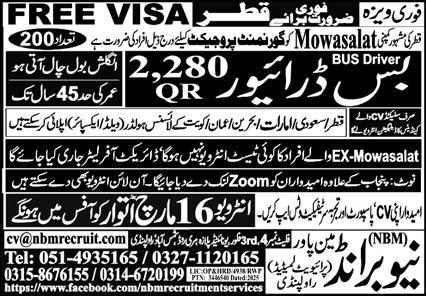 New Brand Manpower Doha, doha Qatar invites applications from eligible candidates for the post of bus driver, driver and htv driver as per advertisement of March 13, 2025 published in daily Express Newspaper. Educational qualifications required Matric and Intermediate etc.