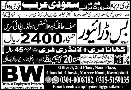 Vacant posts including bus driver, driver and htv driver are announced in BW Overseas Employment Promoters Riyadh, makkah Saudi Arabia as per 18 May 2024 advertisement in daily Express Newspaper. Candidates with Matric and Intermediate etc. educational background will be preferred.