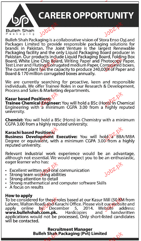 Business Development Executives and Trainee Chemical Engineers are required in Bulleh Shah Packaging Pvt Ltd in Lahore.