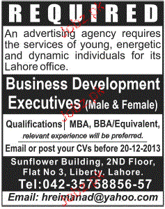 Business Development Executives are required in Lahore