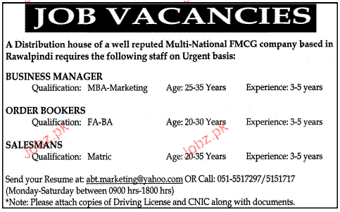 Business Managers, Order Bookers Job Opportunity