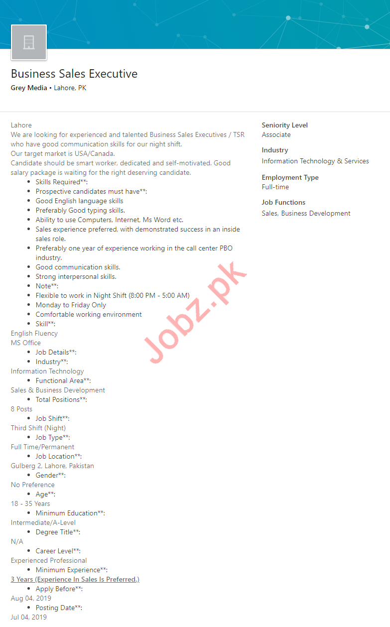 Latest Grey Media Group Sales Posts Lahore 2025