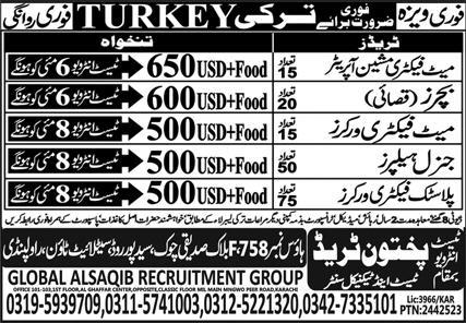 Pakhtoon Trade Test & Technical Center Istanbul, ankara Turkey invites applications from eligible candidates for the post of general helper, meat factory machine operator, plastic factory worker, meat factory worker and butcher as per advertisement of May 6, 2025 published in daily Express Newspaper. Candidates with Bachelor, DAE, Matric and Intermediate etc. educational background will be preferred.