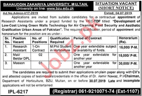 BZU University Multan Jobs 2019 For Research Assistant