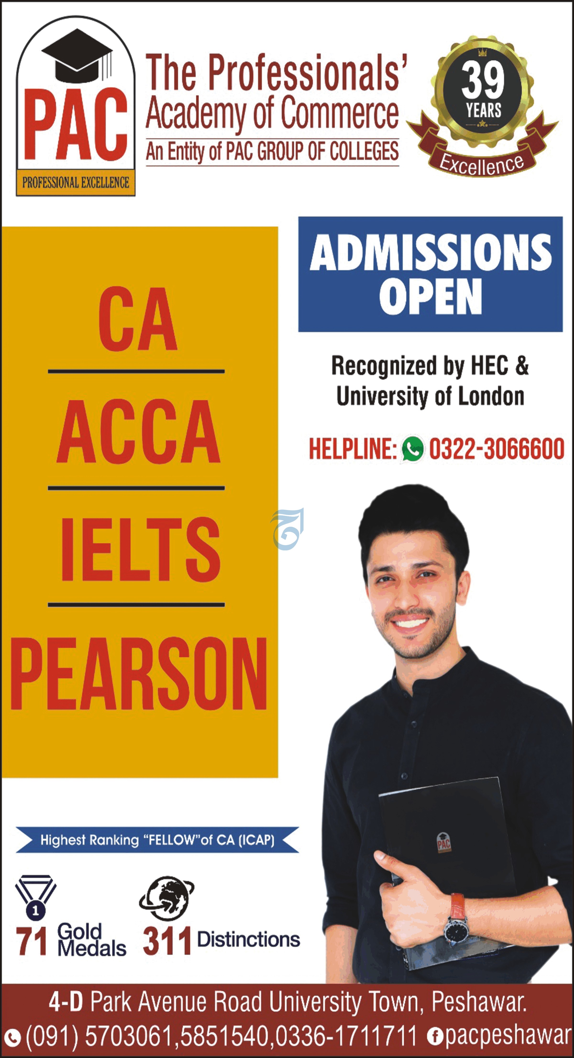 The Professionals Academy of Commerce has announced admissions 2025 for ca . Students can enroll for admissions in The Professionals Academy of Commerce Islamabad Islamabad Pakistan for academic year 2025 to continue campus based or online education in Science College. Eligible students for fulfilling criteria for admissions in can enroll as per Government admission policy 2025 till closing date. Read newspaper ad for exact details.