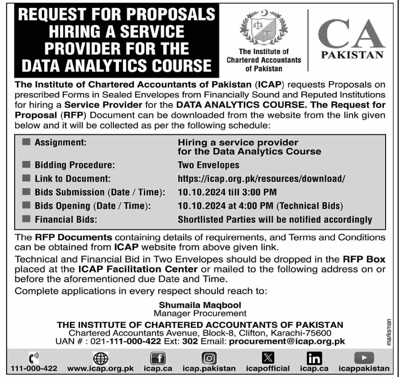 The Institute of Charted Accountants of Pakistan CA Pakistan Data Analytics Course admissions 2024 has been started. Eligible students can apply for academic admissions 2024 in The Institute of Charted Accountants of Pakistan CA Pakistan Karachi Sindh Pakistan for Science Course. Students for admissions in Course can apply for online or campus classes as per Government institute criteria till admission closing date October 9, 2024. Read newspaper ad for exact details.