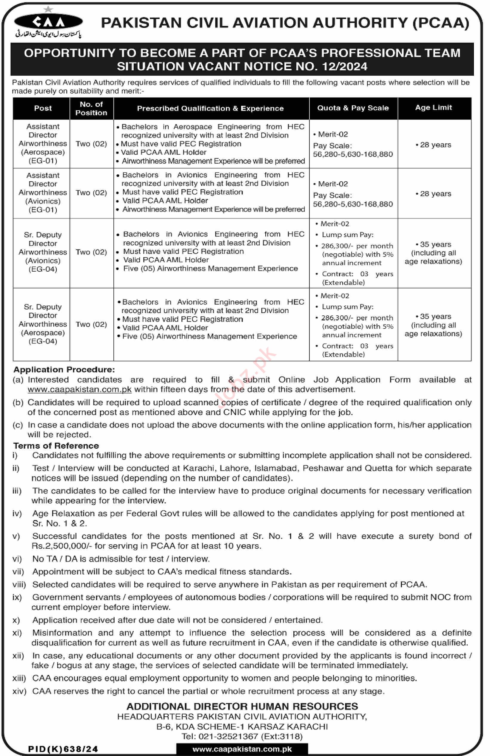 Pakistan Civil Aviation Authority CAA Karachi, karachi Sindh Pakistan invites applications from eligible candidates for the post of Assistant Director Avionics, Assistant Director Airworthiness, Assistant Director Aerospace and Deputy Director Aerospace as per advertisement of September 8, 2024 published in daily Dawn Newspaper. Preferred Education is Master, Bachelor and MS etc.