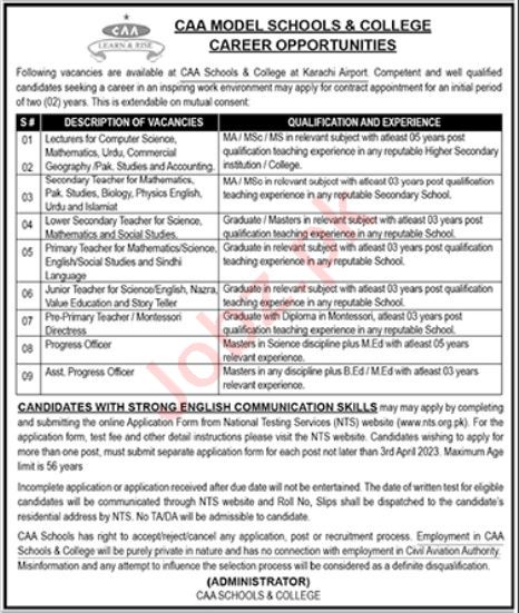 Latest Education jobs and others Government jobs in CAA Model School & College closing date is around April 3, 2023, see exact from ad. Read complete ad online to know how to apply on latest CAA Model School & College job opportunities.