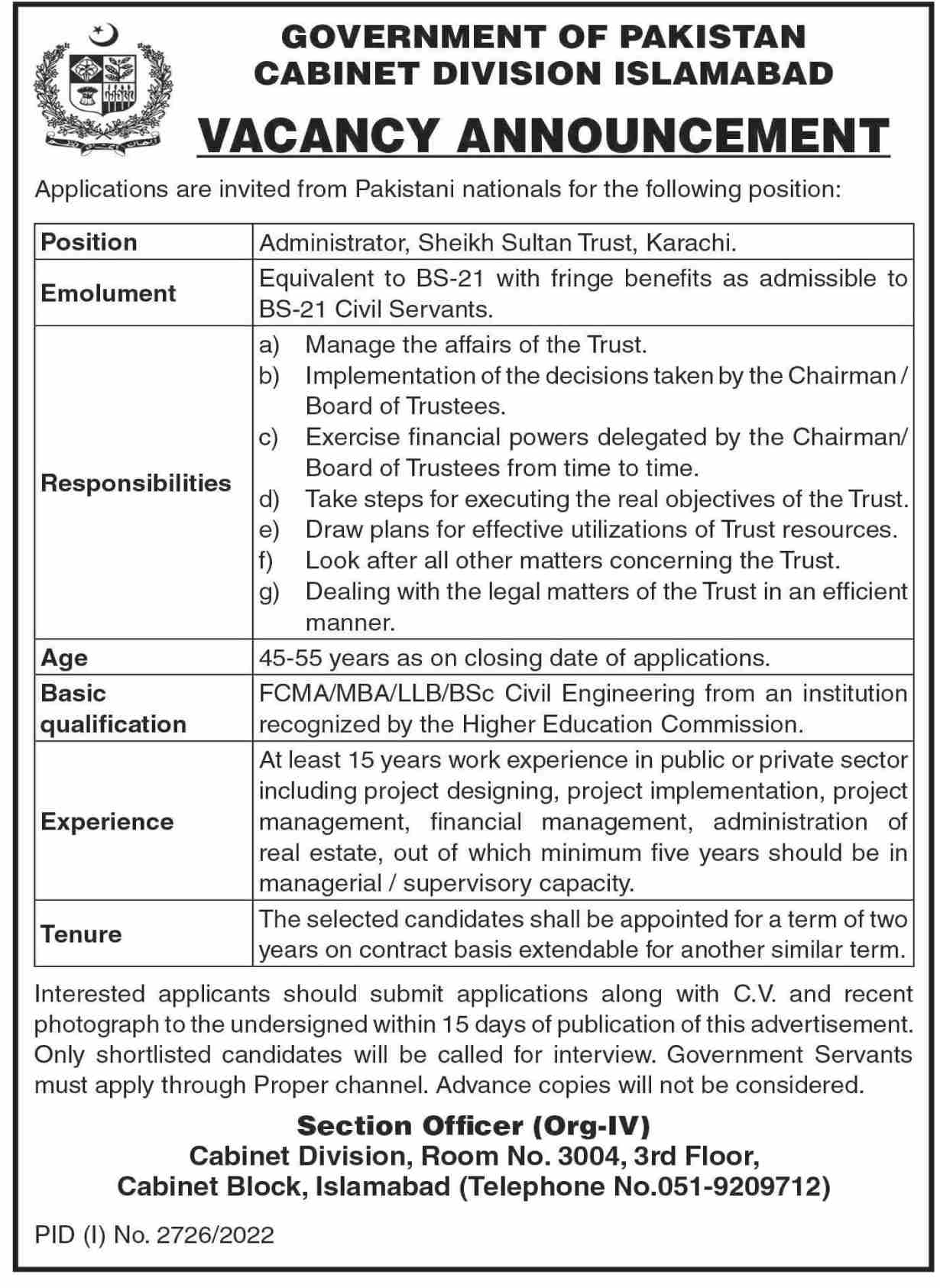 Vacant posts including administrator are announced in Cabinet Division Islamabad, islamabad Islamabad Pakistan as per 29 October 2022 advertisement in daily Dawn Newspaper. Preferred Education is Bachelor, Master and MBA etc.