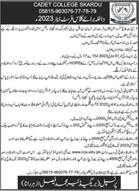 Admissions in Cadet College 2023 for 11th Class has been announced. Students can enroll for admissions in Cadet College Skardu Gilgit Baltistan Pakistan for academic year 2023 to continue campus based or online education in Science College. Students for admissions in Intermediate can apply for online or campus classes as per Government institute criteria till admission closing date May 20, 2023. Read newspaper ad for exact details.