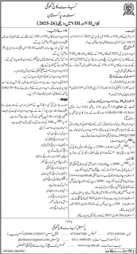 Cadet College 7th and 8th Classes admissions 2025-26