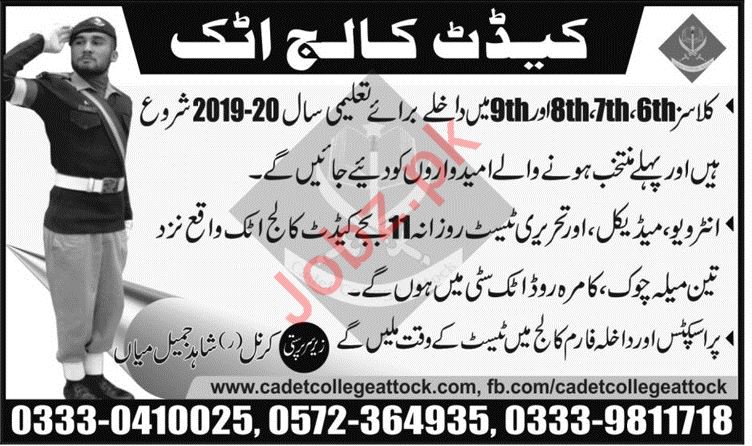 Cadet College Attock, Pakistan are announced admissions spring 2019 for academic session 2019 to 2020 for the classes of Class 6h, Class 7th, Class 8th and Class 9th. Read newspaper ad for exact details.