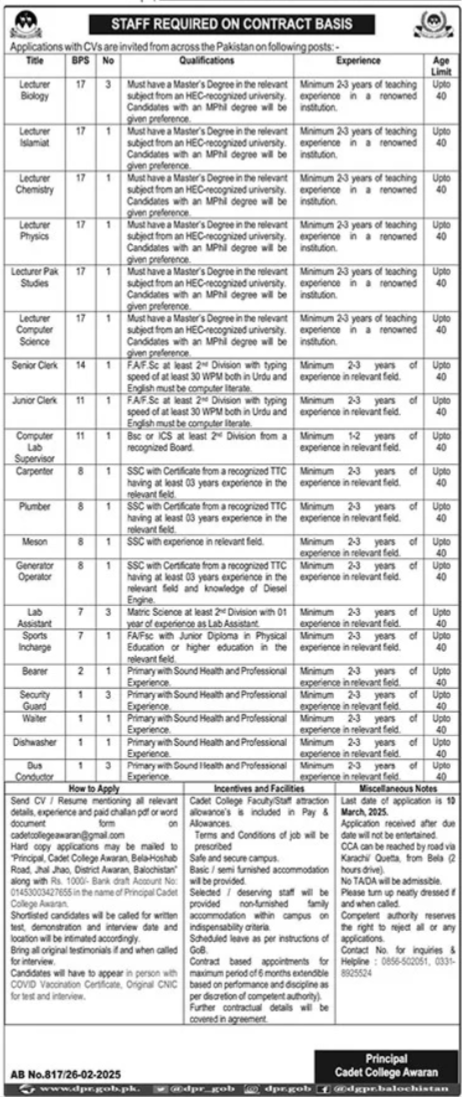 Cadet College jobs advertisement dated about 27 February 2025 in daily Jang Newspaper invites application for the vacant post of lecturer physics, carpenter, waiter, security guard, lecturer chemistry, bus conductor, bearer, lecturer, lab assistant, mason, lecturer pak studies, lecturer biology, computer lab supervisor, dishwasher, plumber, lecturer islamiat, lecturer computer science, clerk, generator operator and sports incharge in Awaran, awaran Balochistan Pakistan. M.sc, Matric, Intermediate, Others, MS, MA, Master, Primary and MCS etc. educational qualification will be preferred.