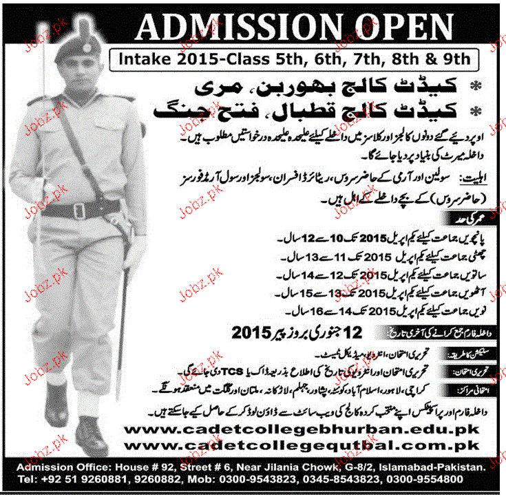 Cadet College Bhurban Admission in Class V to IX in Murree. Read newspaper ad for exact details.