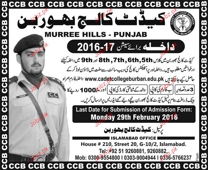 Cadet College Bhurban Admission in Class V to IX in Bhurban. Read newspaper ad for exact details.
