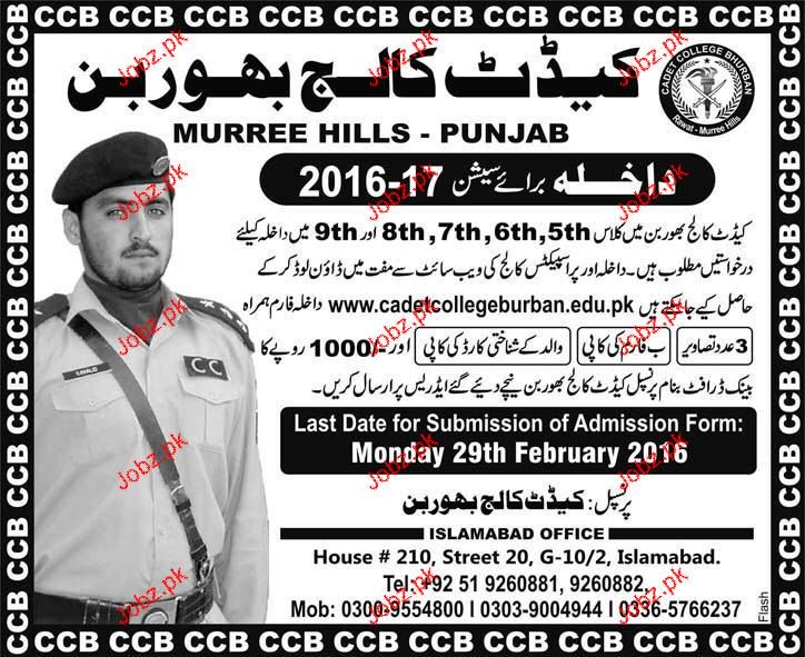Cadet College Bhurban Admission in Class V to IX in Murree. Read newspaper ad for exact details.