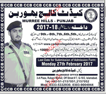Cadet College Bhurban Admission in Class V to IX in Bhurban. Read newspaper ad for exact details.
