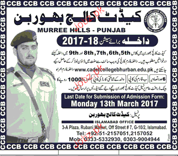 Cadet College Bhurban Admission in Class V to IX in Bhurban. Read newspaper ad for exact details.