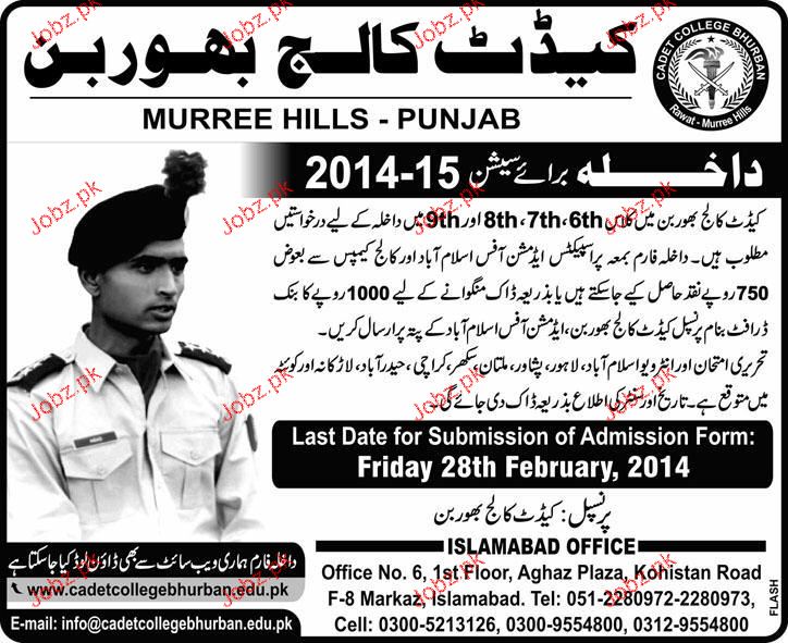 Cadet College Bhurban Admission in Class VI to IX in Murree Read newspaper ad for exact details.