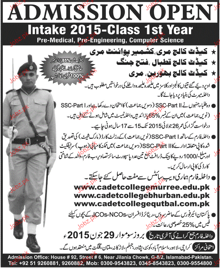 Cadet College Bhurban Admission in Class XI in Murree. Read newspaper ad for exact details.