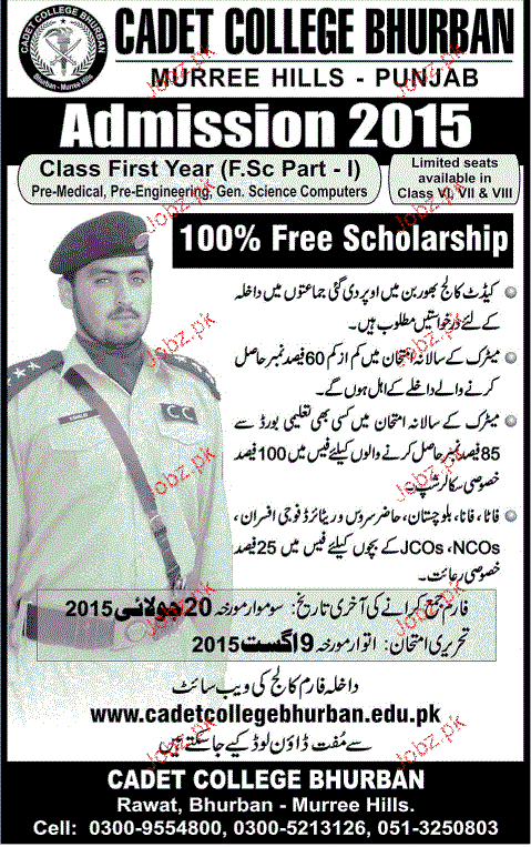 Cadet College Bhurban Admission in Class XI in Murree. Read newspaper ad for exact details.