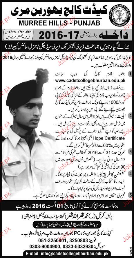 Cadet College Bhurban Admission in Class XI in Murree. Read newspaper ad for exact details.