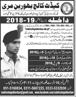 Cadet College Bhurban Murree Admission in Class V to IX in Murree. Last date for submission of admission forms is 15 January 2018. Admission Test will be held on 18-03-2018. Read newspaper ad for exact details.