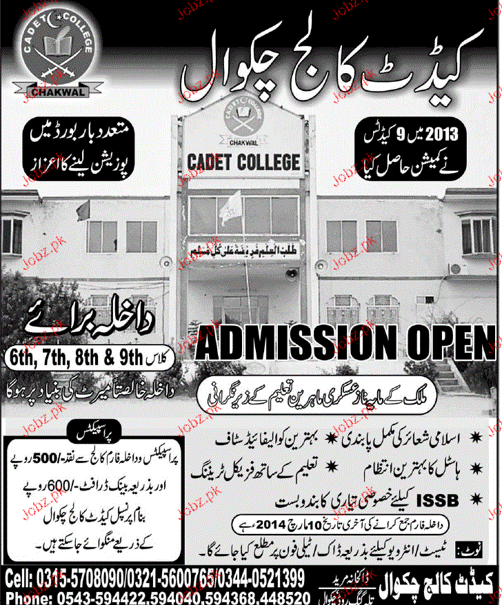 Cadet College Chakwal Admission in Class VI to IX in Chakwal Read newspaper ad for exact details.