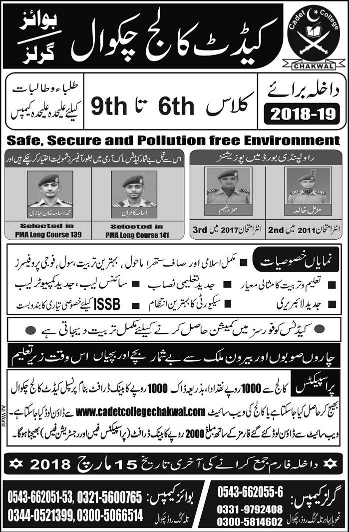 Cadet College Chakwal Admission in Class VI to IX in Chakwal. Admission Session 2018-2019. Seprate Campuses for Boys and Girls. Admission Open for Both Male / Female Students Read newspaper ad for exact details.