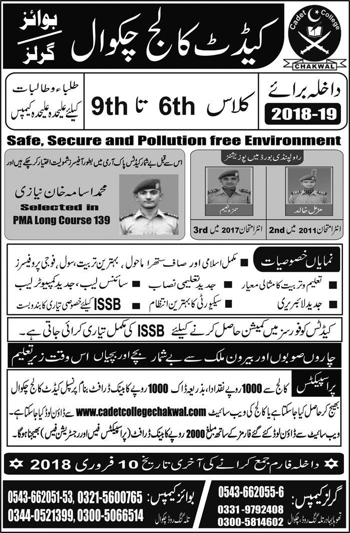 Cadet College Chakwal For Boys and Girls Admission in Class VI to IX in Chakwal. Last date for submission of admission forms is 10 January 2018. Separate campus for boys and Girls. Read newspaper ad for exact details.